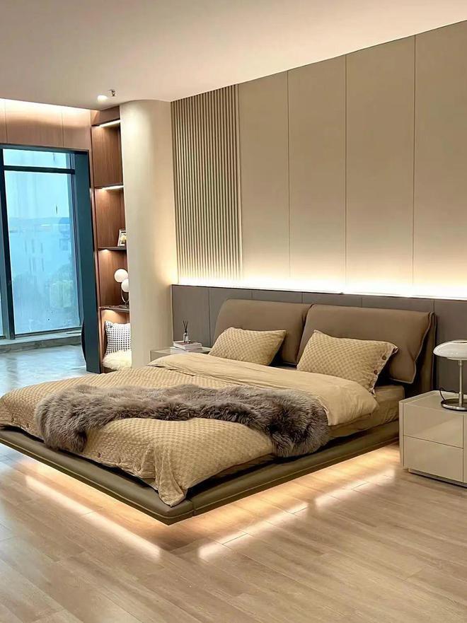 要说优点,那颜值是没得说,简约大气、又有层次感;尤其是配上那一圈灯带,让卧室氛围感直接拉满。