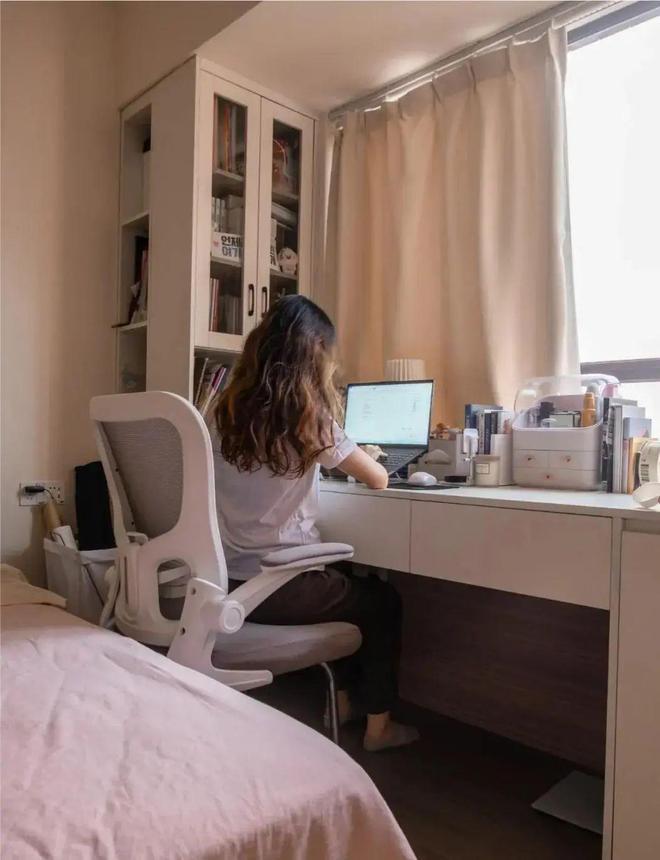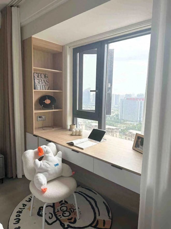 真搞不懂是哪个大聪明想出来的设计,说卧室飘窗浪费面积,不如改成休闲书桌,兼顾收纳与颜值,一举两得。