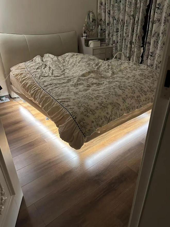 关灯后的效果,就和打地铺差不多,还不如普通床好看呢!床底还都是卫生死角,根本擦不到,除非你每天趴在地上,拿拖布伸进去打扫。