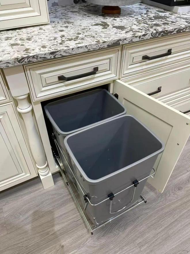 而且,扔垃圾时,不小心扔在柜子里,还要伸着胳膊去打扫,太费事了。真不如在厨房角落,放个大垃圾桶更省事、实用。